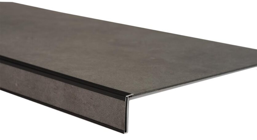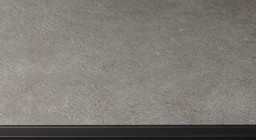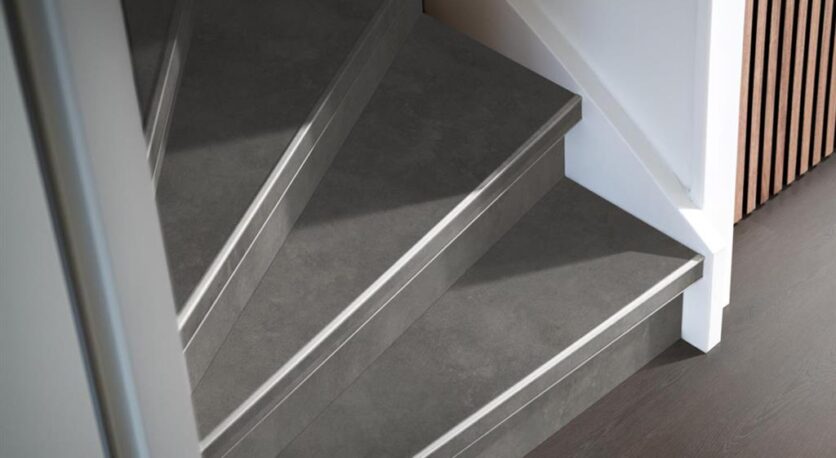 Het betonlook decor van de pvc traptreden set XL is verkrijgbaar in twee trendy kleuren: anthracite en grey. Door de extra grote slabs kunnen ook brede tredes naadloos met pvc bekleed worden.