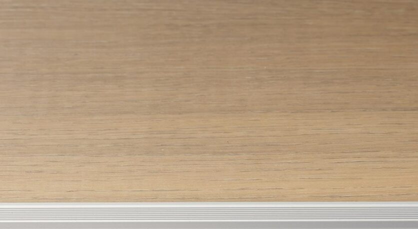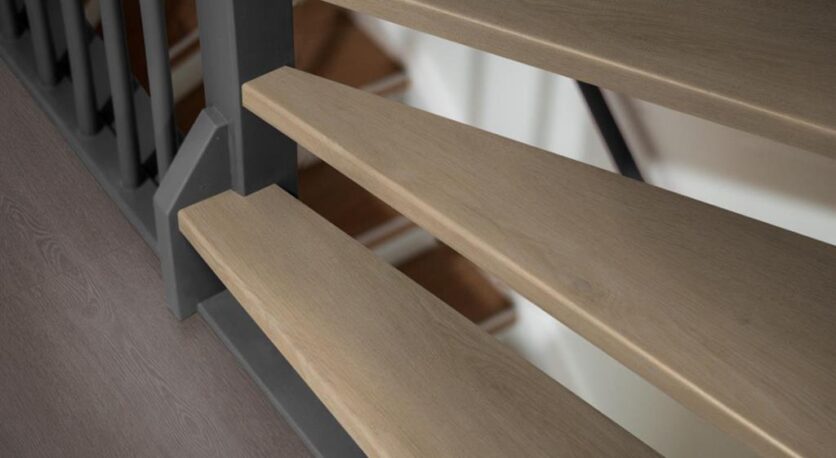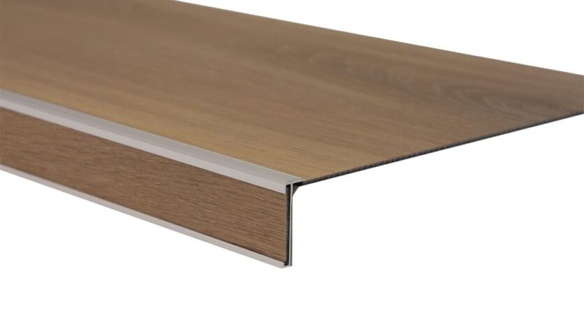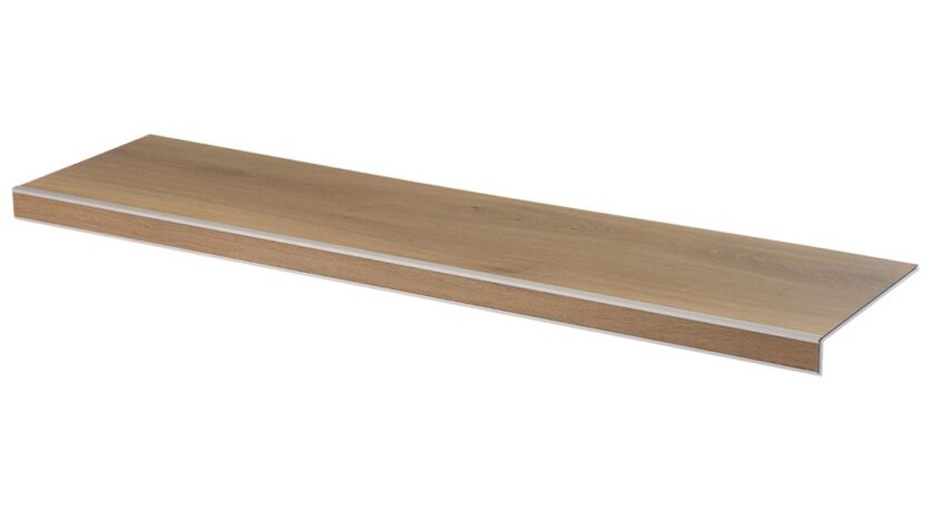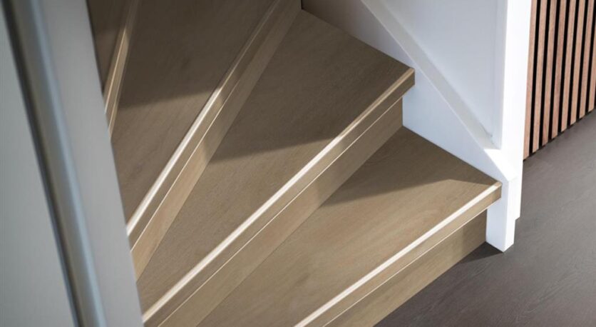 Het houtlook decor van de pvc traptreden set XL is verkrijgbaar in twee trendy kleuren: natural en beige. Door de extra grote slabs kunnen ook brede tredes naadloos met pvc bekleed worden.